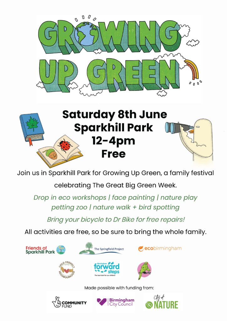 We are very excited to be part of this special event in Sparkhill Park on Saturday 8 June, 12-4pm, for Growing Up Green, a free family festival celebrating The Great Big Green Week. Join us for drop-in eco workshops, face painting, nature play, a petting zoo, a nature walk and bird spotting. All activities are FREE, so be sure to bring the whole family. Call 0121 777 2722 or email [email protected] for more information.